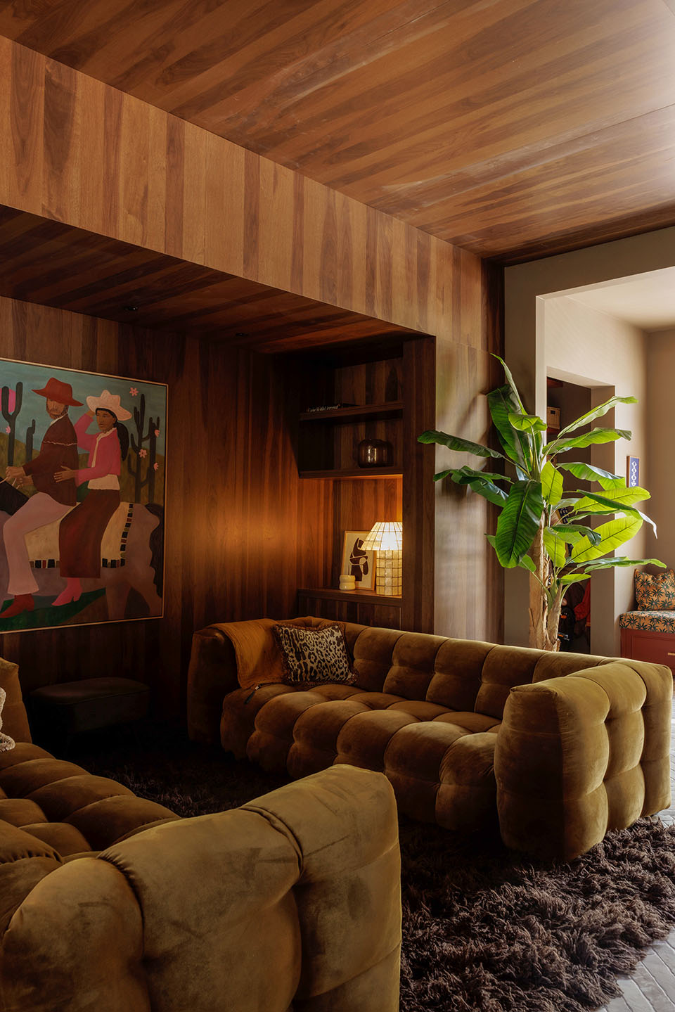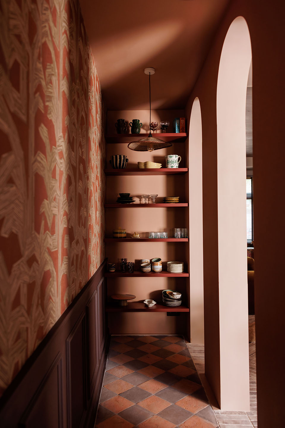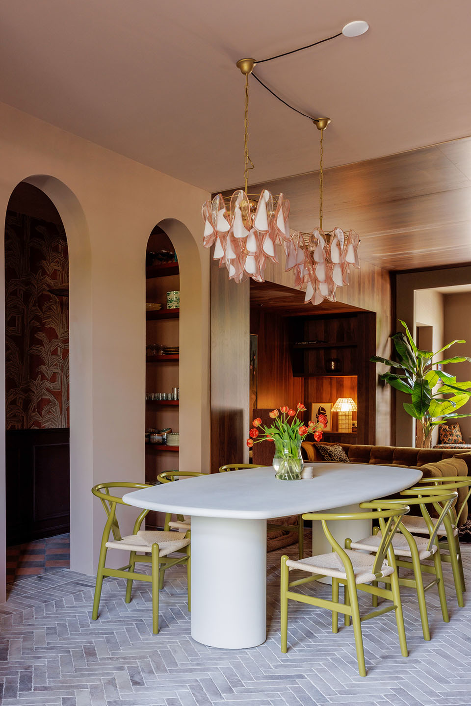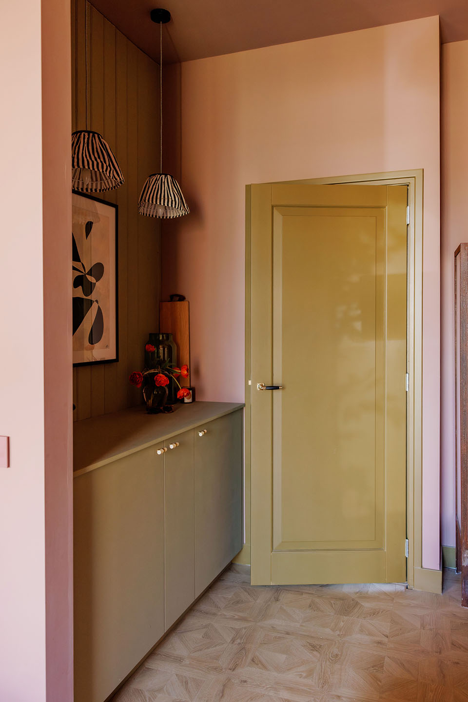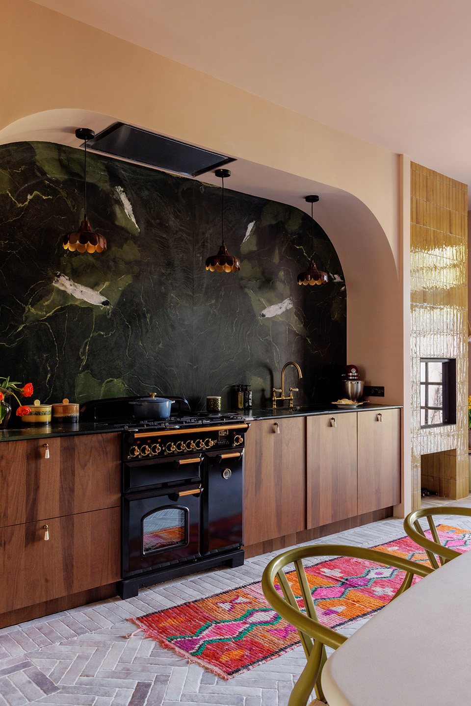 In dit herenhuis in Breda werd de hele begane grond opnieuw ingedeeld – behalve de lange gang met karakteristieke boogvormen, die vonden we juist prachtig om te behouden en te herhalen. Voorin kwam een royale entree met meer opbergruimte. Het middenstuk werd een warme woonkamer – letterlijk, want wanden én plafond zijn hier nu bekleed met hout. Achterin zorgt groen marmer met haard voor een krachtig statement.